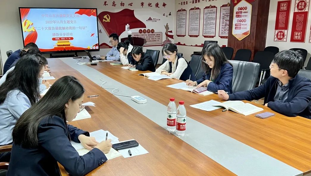 聽(tīng)完各位黨員同志的感悟分享,齊盛期貨公司黨支部書記高軍對(duì)全體黨員提出了要求。高軍指出,要全面準(zhǔn)確學(xué)習(xí)領(lǐng)會(huì)黨的二十大精神,堅(jiān)持知行合一,貫徹落實(shí)好黨的二十大作出的重大決策部署,增強(qiáng)“四個(gè)意識(shí)”、堅(jiān)定“四個(gè)自信”、做到“兩個(gè)維護(hù)”。要在集團(tuán)黨委統(tǒng)一領(lǐng)導(dǎo)下,密切配合,把學(xué)習(xí)宣傳貫徹黨的二十大精神與加強(qiáng)領(lǐng)導(dǎo)班子建設(shè)和基層黨組織建設(shè)結(jié)合起來(lái)。